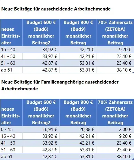 Das gilt sowohl für den eigenen Vertrag des/der Arbeitnehmenden sowie für ggf. bereits bestehende Verträge mitversicherter Familienangehörige. Der Beitrag wird pro Person zum Alter bei Austritt neu kalkuliert; Beitragsrabatte aus dem Gruppenvertrag des Arbeitgebers entfallen.